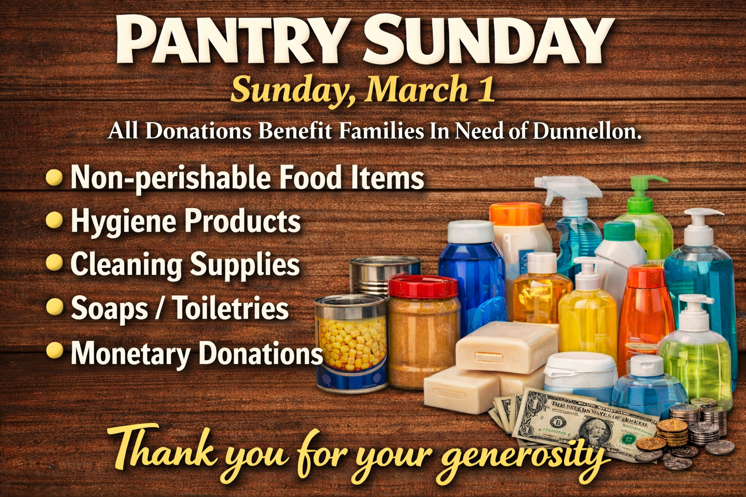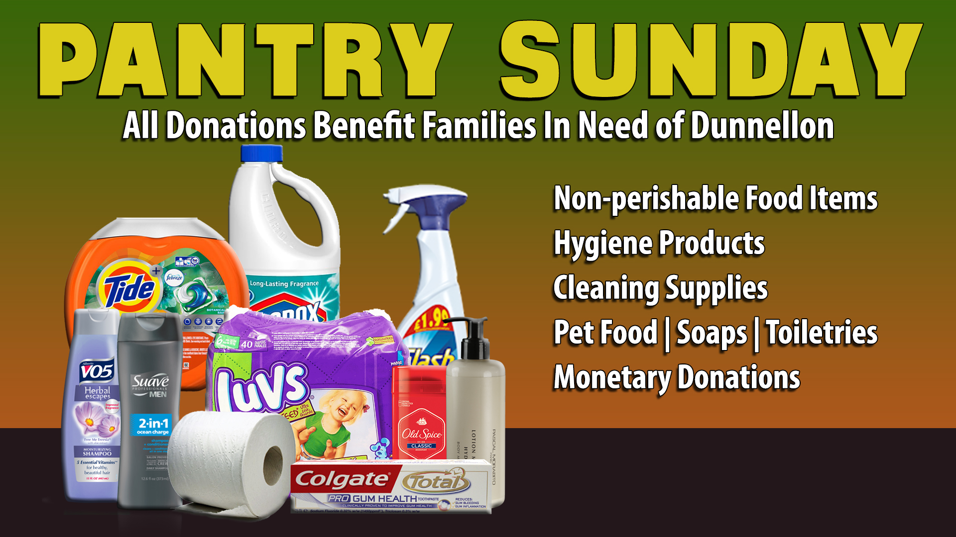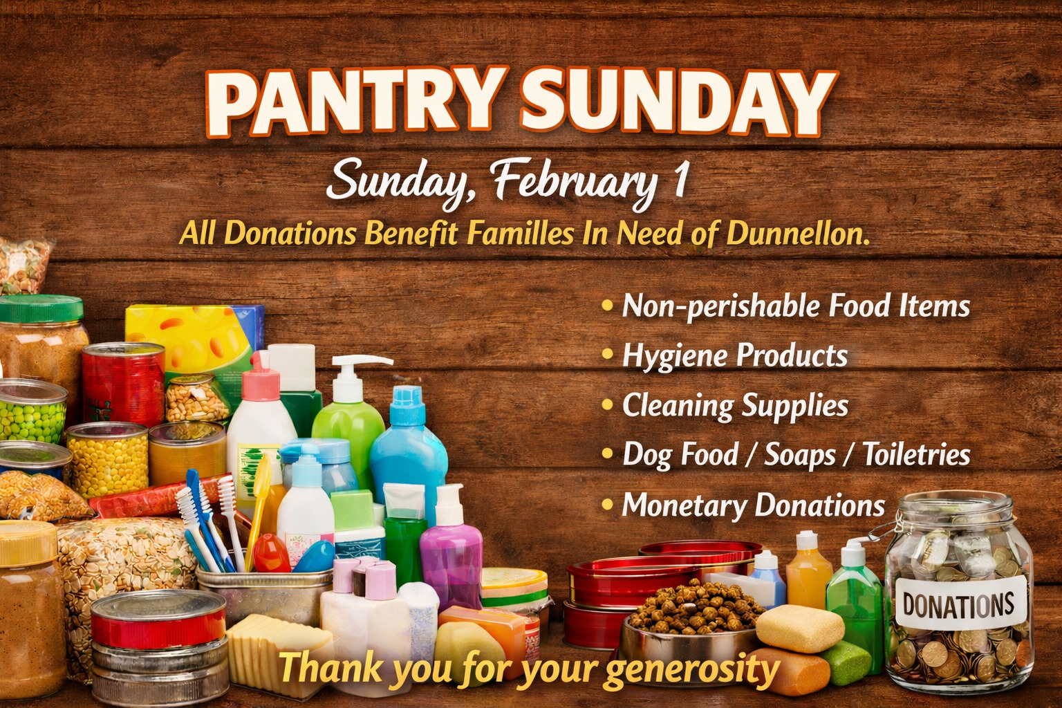 . You can bless people in our area by donating non perishable food items and hygiene products. All donations go to the Families In Need Food Pantry. Thank you for your generosity.